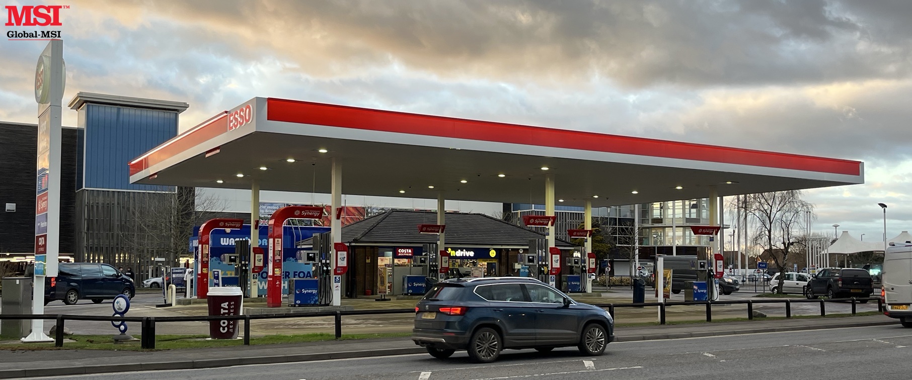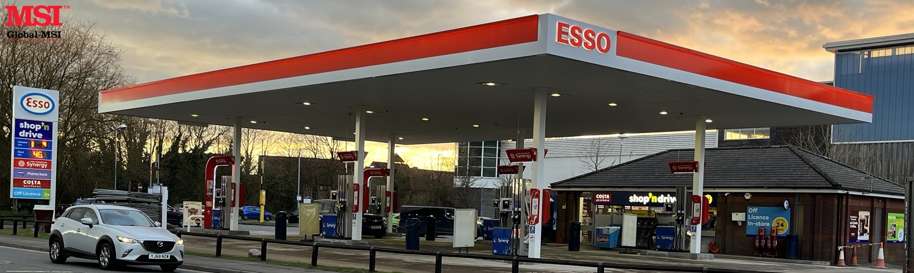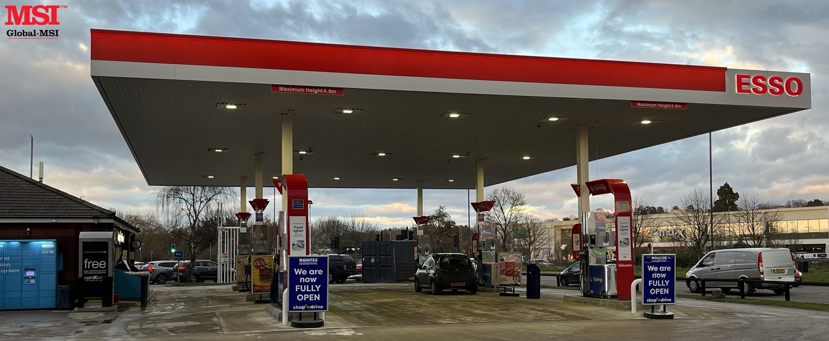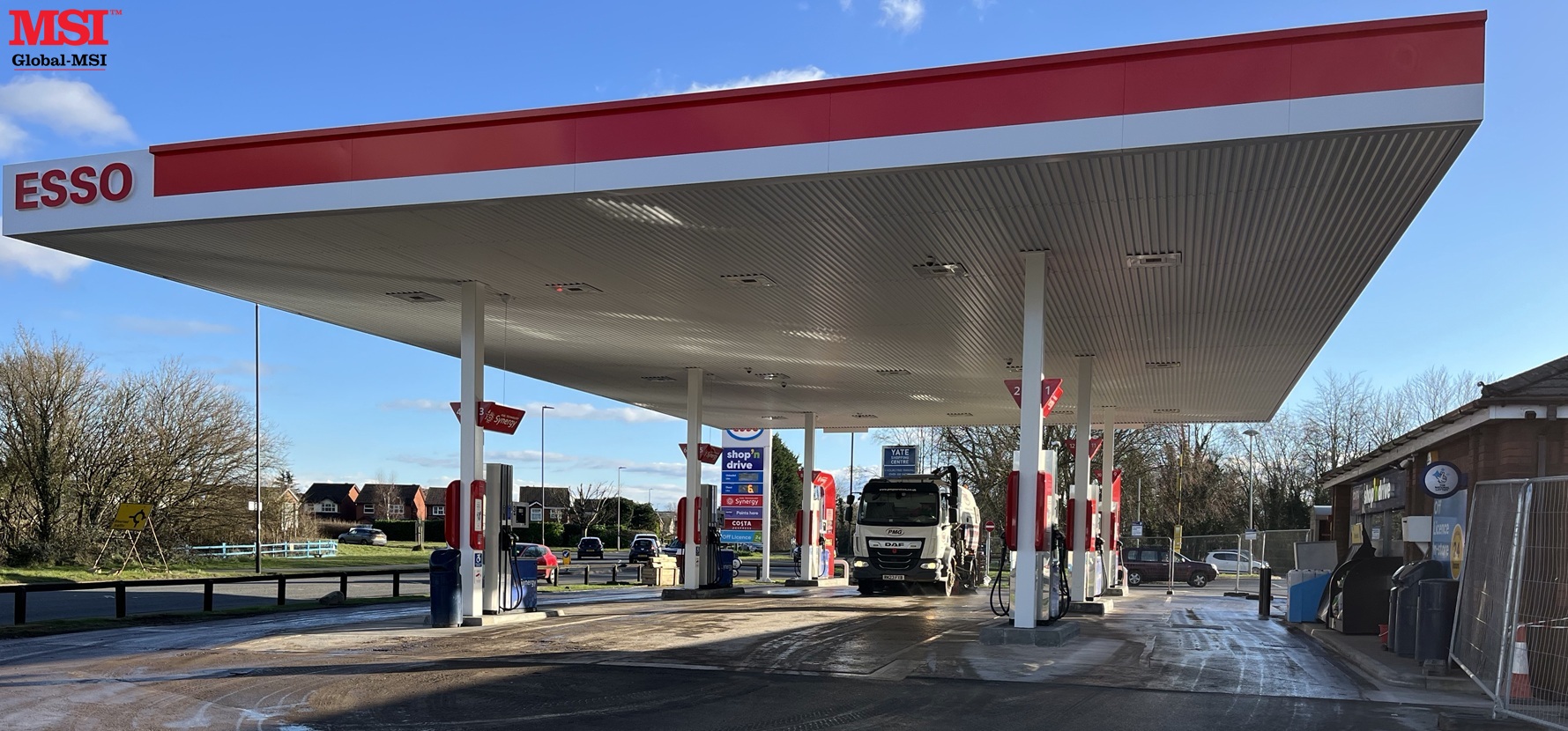 Global-MSI is proud to announce completion of a new canopy for Rontec at Precinct Service Station in Yate, northeast of Bristol. The project included removal of the old canopy, the design, manufacture & installation of the new canopy and manufacture and installation of the Esso branding.
