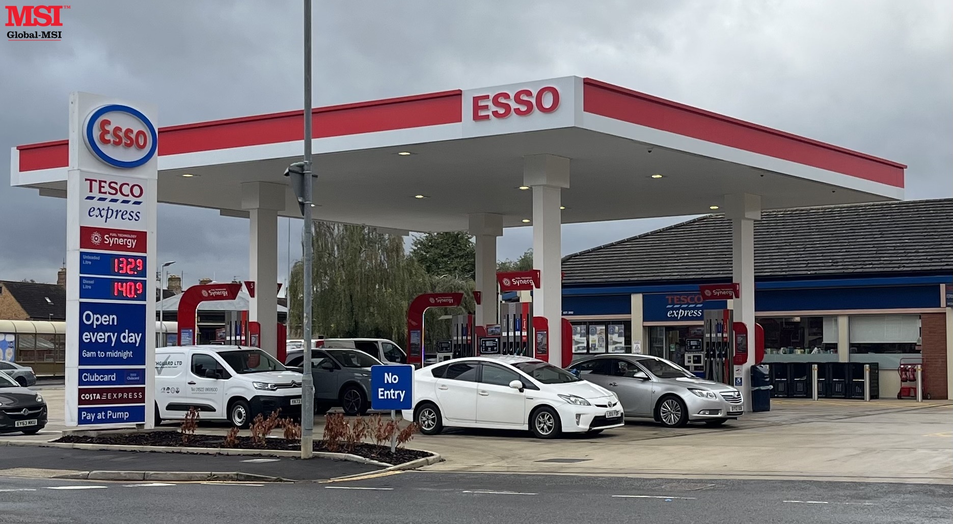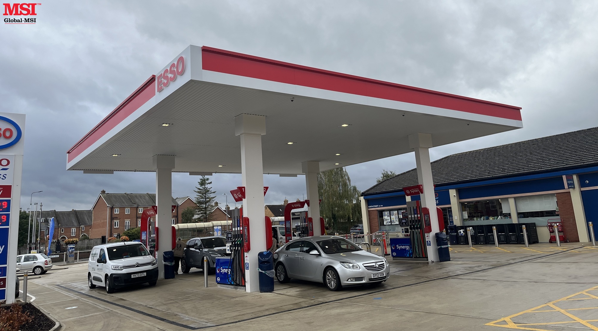 Global-MSI recently completed the design, fabrication, & installation of this new canopy at Esso Express in Bourne, Lincolnshire. The canopy was successfully placed on top of columns supplied with a previous canopy, following detailed survey work that ensured a perfect fit.